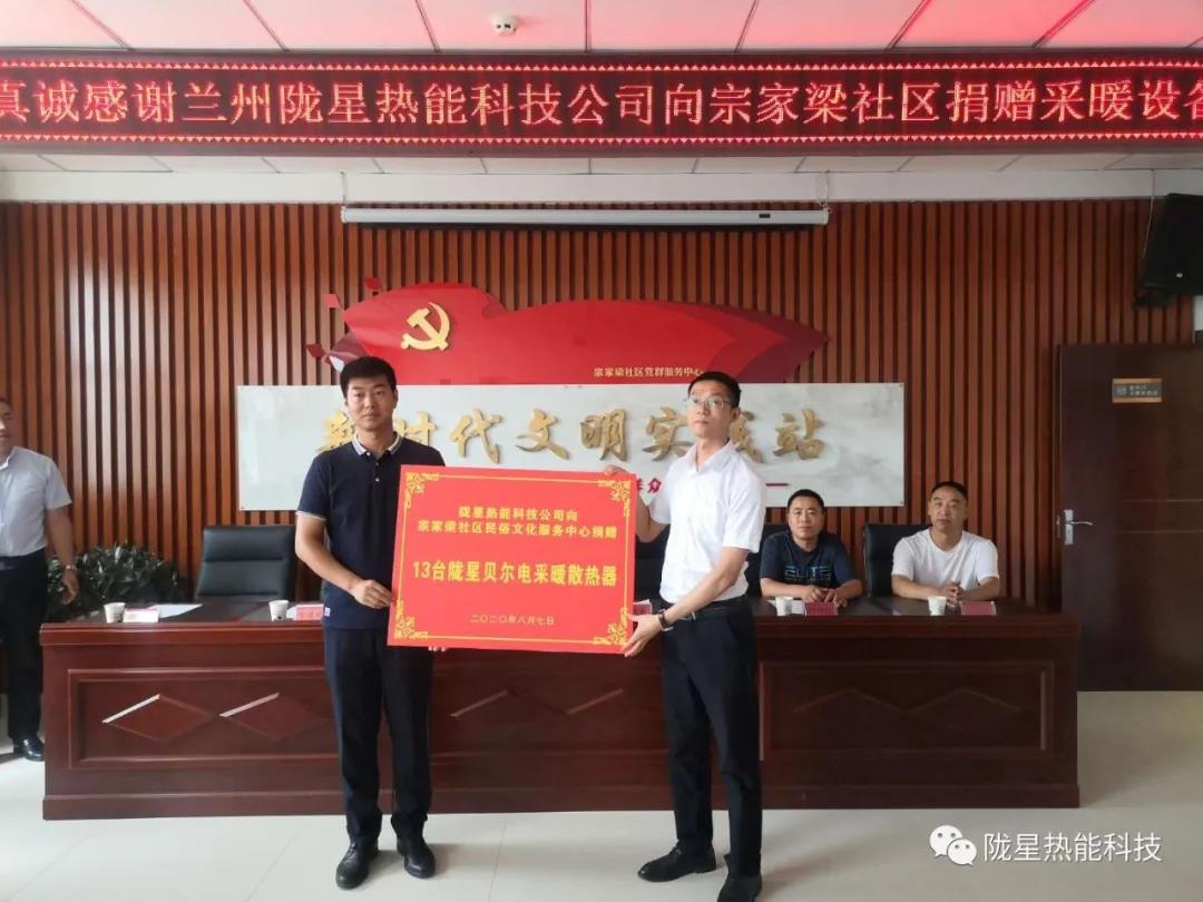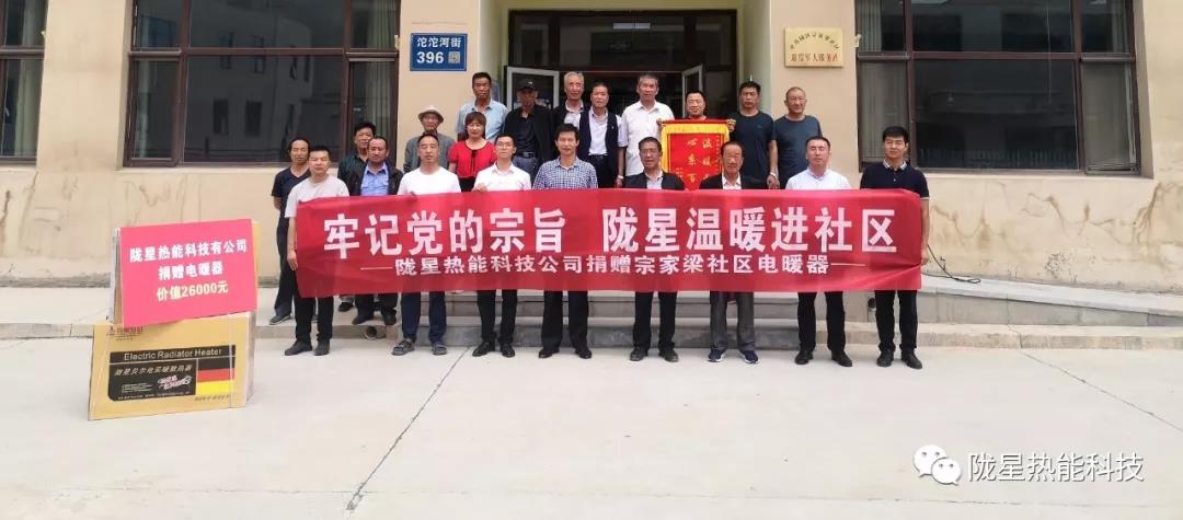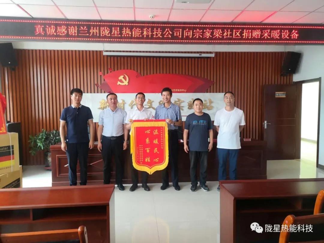 隴星熱能科技公司副總經理、銷售公司總經理劉靜,副總經理、廠長葉仲權,辦公室主任張志遠,區域經理漆全勝代表公司參加了此次愛心捐贈活動。劉靜在捐贈儀式說:“隴星公司1998年成立,公司以生產采暖散熱器、太陽能集熱器為主,集科研、制造、營銷為一體。2015年隴星響應甘肅省及蘭州市政府出城入園的號召,隴星工廠從高新區搬遷至蘭州新區,并積極投身蘭州新區的建設,創造了良好的經濟效益和社會效益。同時隴星熱能科技公司牢記黨的宗旨,肩負社會責任,熱心公益事業。今天受隴星集團領導及公司領導的委托,給宗家梁社區民俗文化中心捐贈13臺電暖器,解決冬季采暖的問題,把隴星溫暖送進宗家梁社區。”蘭州新區中川園區管委會黨委員管委會副主任曾凡彬在會上向隴星熱能科技公司表示感謝,對隴星公司的公益精神給予了高度認可和贊賞。