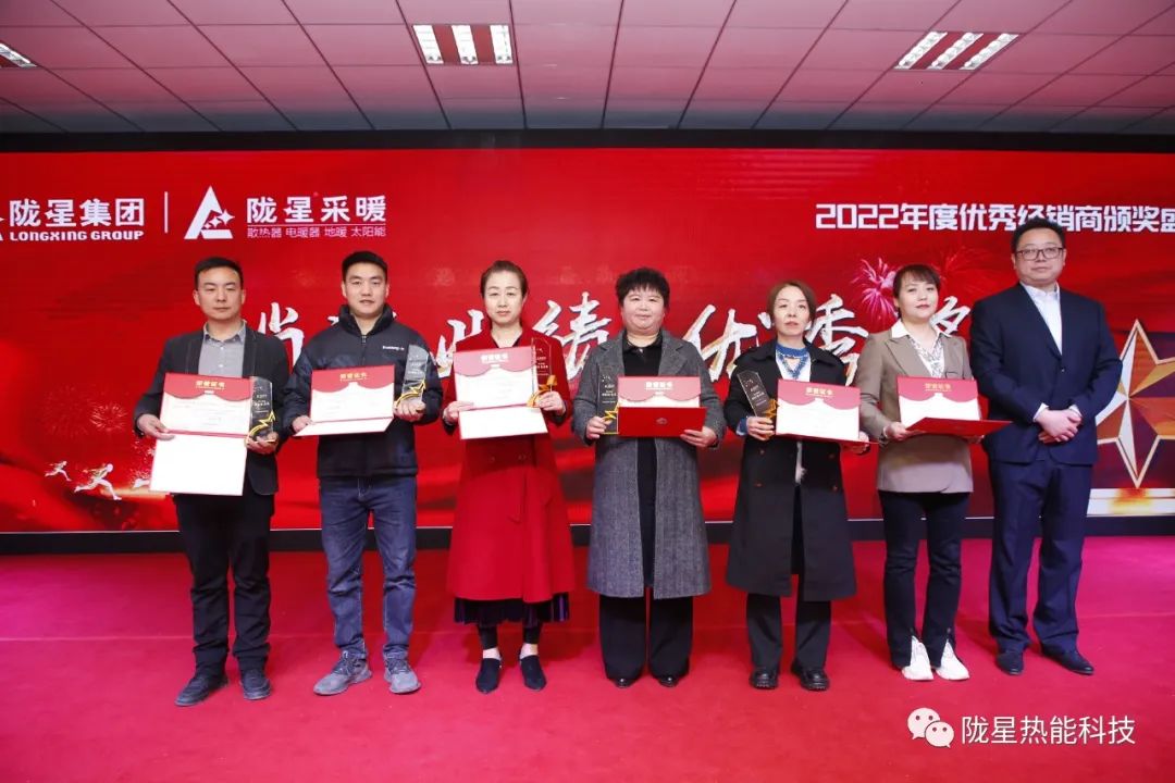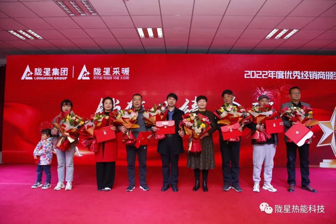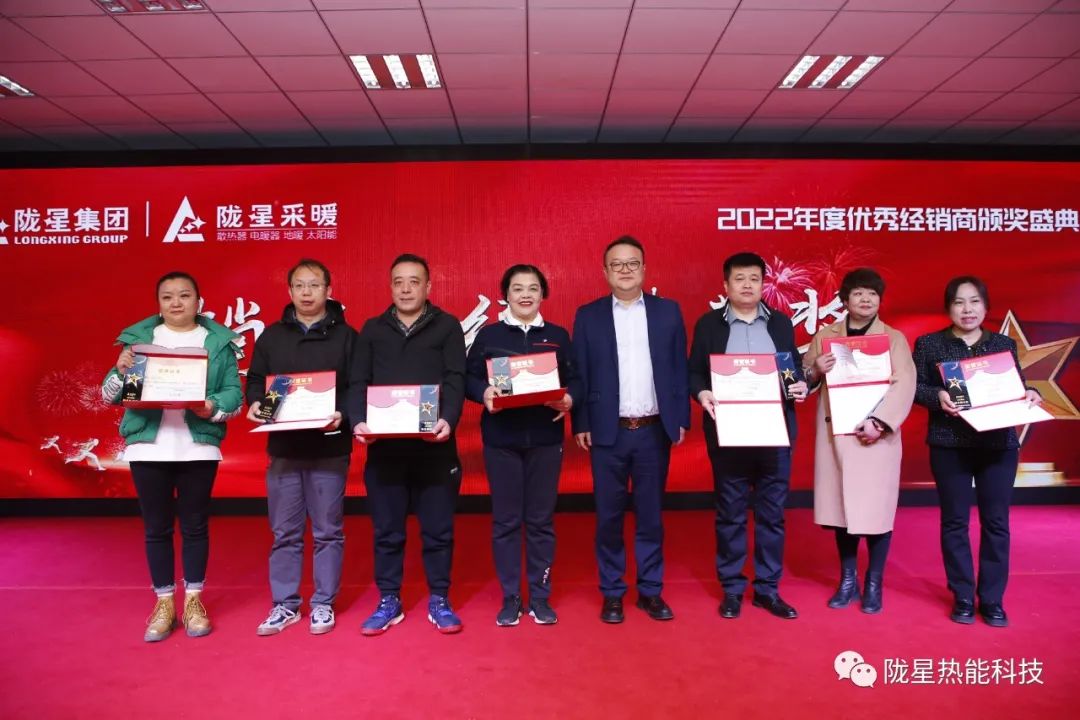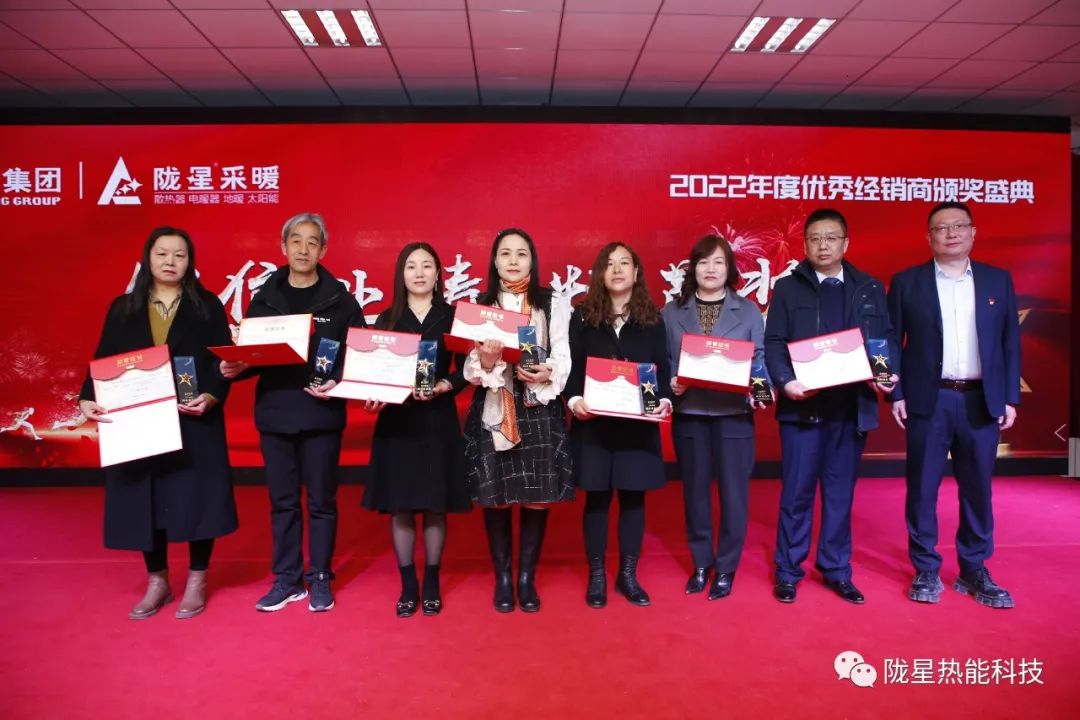 公司的發展離不開攜手共贏、不離不棄的經銷商朋友,也離不開同心同德、同夢同行的員工。本次頒獎盛典上還特別邀請了蘭州區域、北京區域、西安區域、西北區域2022年度的銷售冠軍經銷商給隴星熱能科技公司的“20年功勛員工”頒獎,共28位工齡在20年以上的功勛員工獲獎。