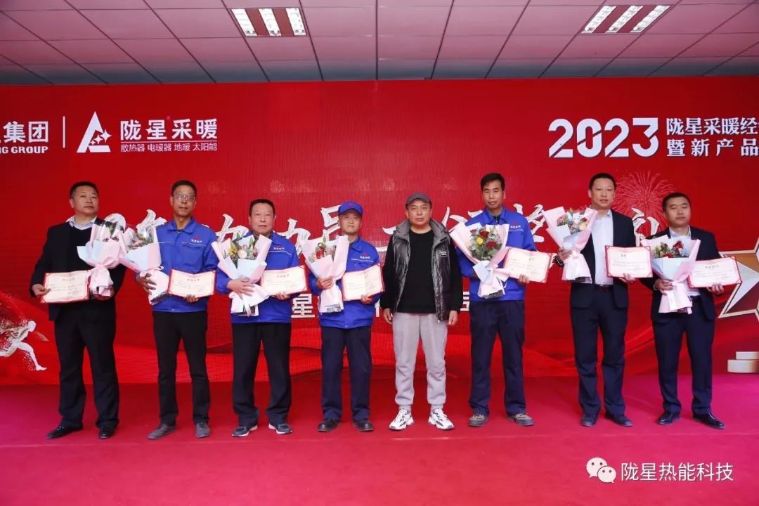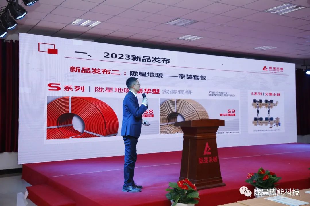 下午4:00,隴星熱能科技公司副總經理、銷售公司總經理劉靜先生代表公司在經銷商年會上發布了公司2023年地暖、電暖器、散熱器等新產品,重點介紹了隴星地暖PERT五層阻氧管全新上市、隴星地暖豪華型家裝套餐S8系列與S9系列、隴星地暖舒適型家裝套餐A6系列與A7系列,以及隴星地暖一站式6包服務、隴星地暖工程專供產品等,工廠產品不斷推陳出新,為經銷商朋友創造了新的商機。
